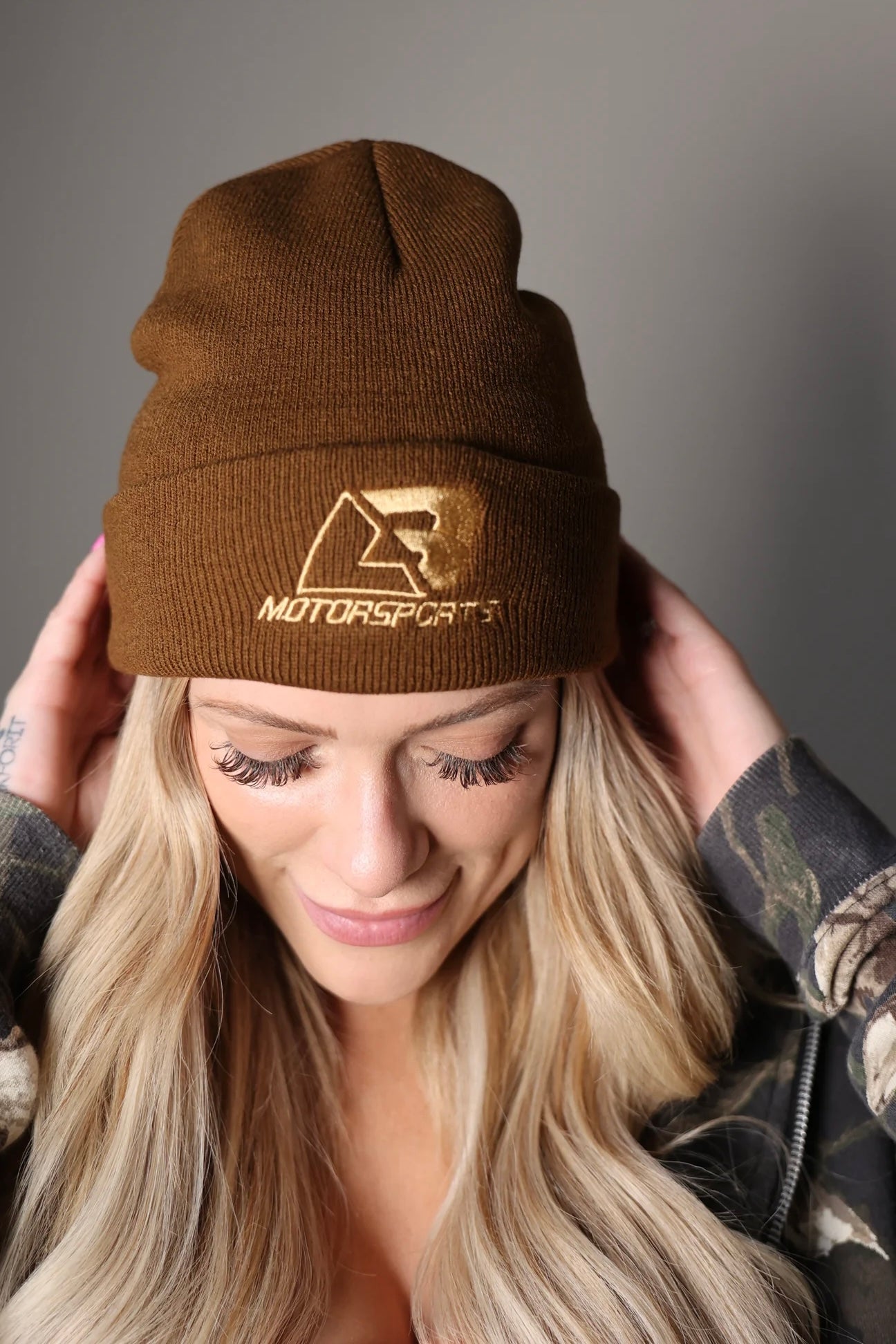 Brown beanie with a gold "LB Motorsports" embroidered on the front