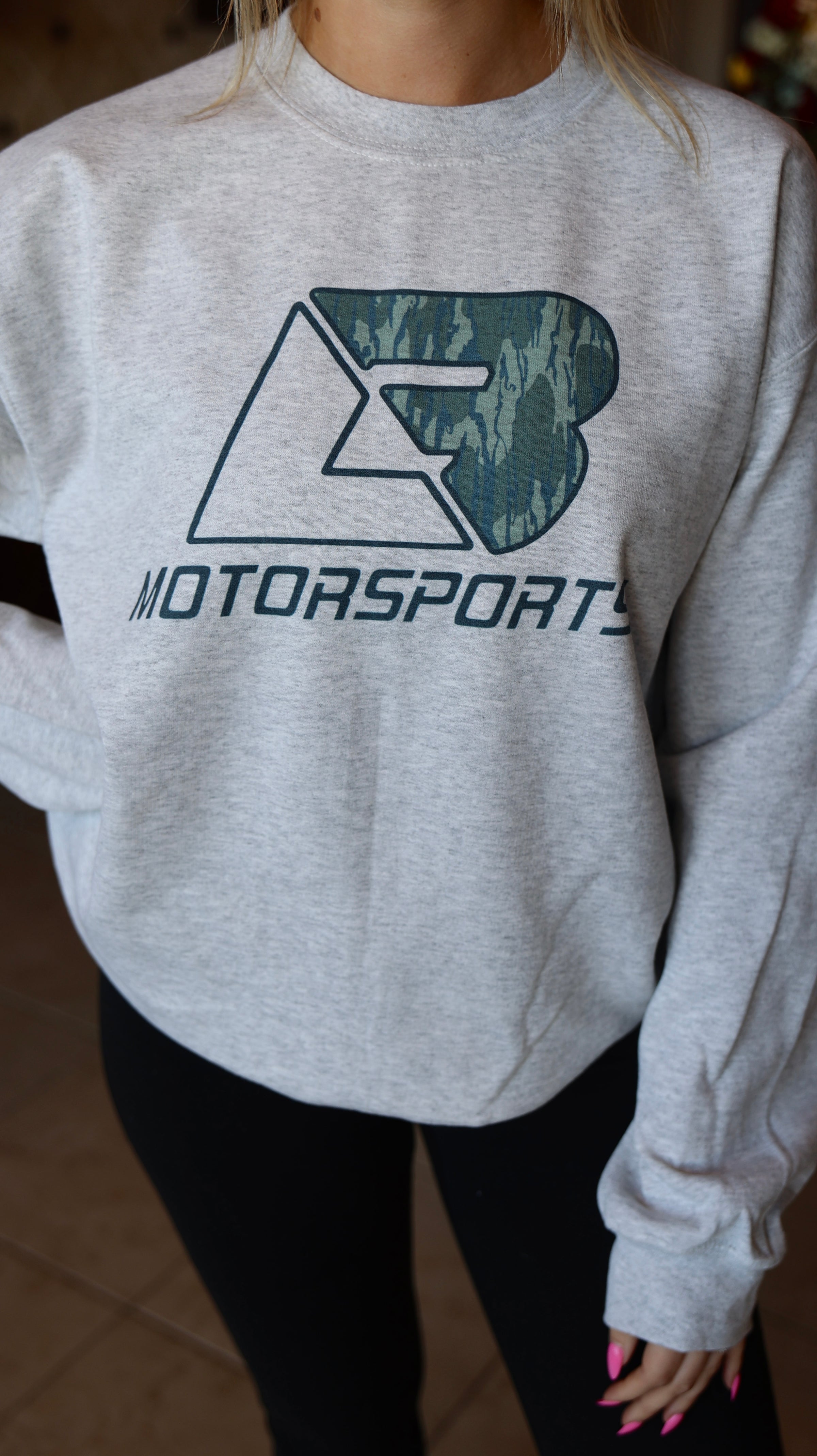 Super soft crewneck with a camo "LB Motorsports" logo sublimation printed on the front.